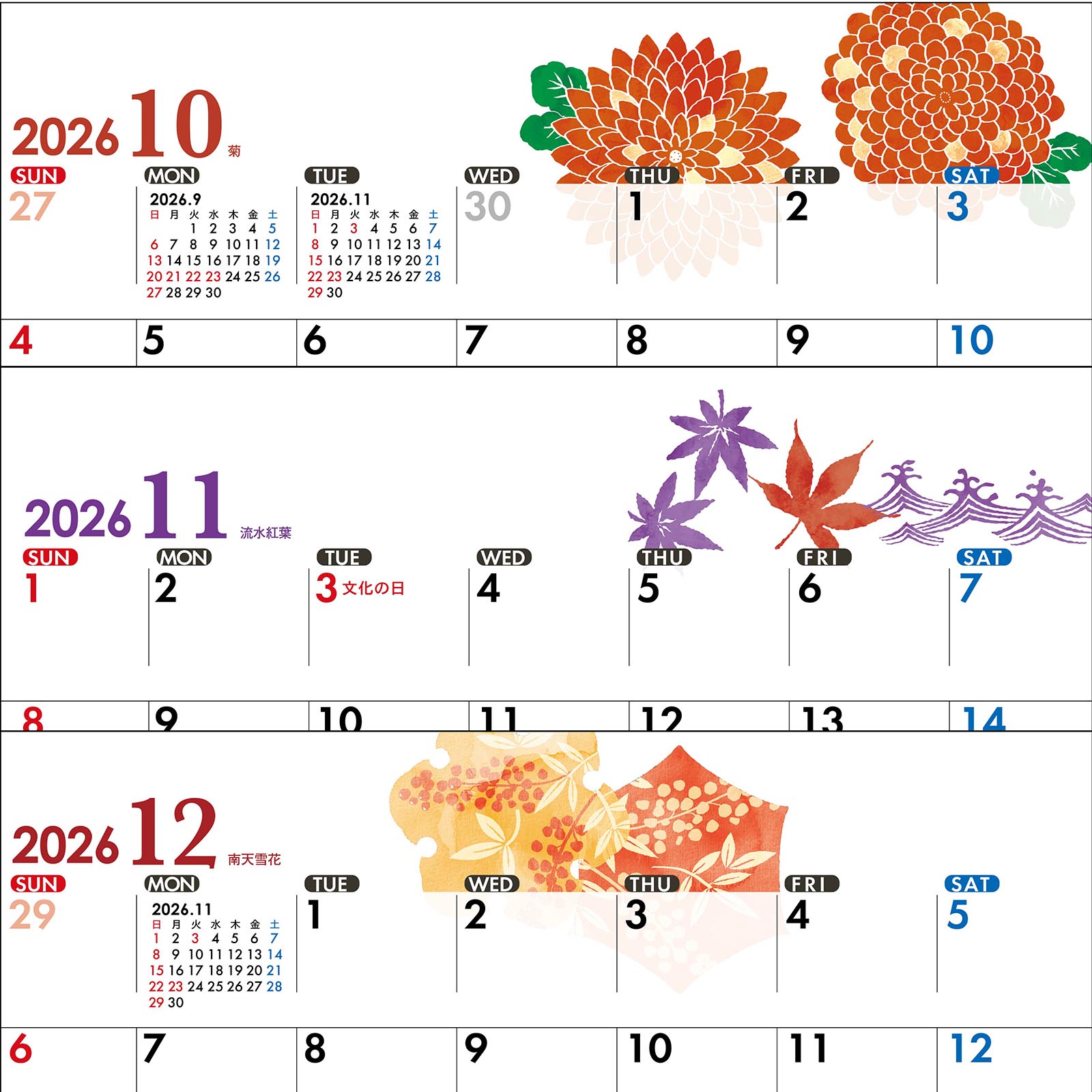 - 2026年 12ヶ月に和柄を添えました。A6サイズで小さめのコンパクト卓上カレンダーです。